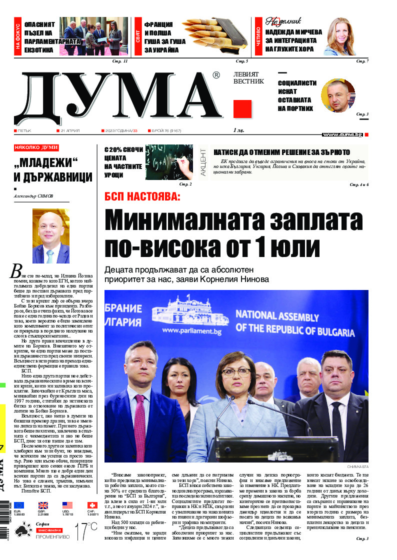 АБОНАМЕНТ за вестник „ДУМА“ за 2026 година. Можете да се абонирате в: „Български пощи“ АД до 15 декември 2025 г., „Доби прес“ ЕООД до 28 декември 2025 г., в редакцията на вестника до 20 декември 2025 г. Каталожен номер 6. Цени: 12 месеца - 149 € / 291,42 лв., 6 месеца - 75 € / 146,69 лв., 3 месеца - 40 € / 78,23 лв., 1 месец - 14 € / 27,38 лв. За повече информация тел. 02 9705 203 и 02 9705 216 отдел „Разпространение” на в-к ДУМА на ул. „Позитано” 20 А. E-mail: abonament@duma.bg АБОНАМЕНТ за вестник „ДУМА“ за 2026 година. Можете да се абонирате в: „Български пощи“ АД до 15 декември 2025 г., „Доби прес“ ЕООД до 28 декември 2025 г., в редакцията на вестника до 20 декември 2025 г. Каталожен номер 6. Цени: 12 месеца - 149 € / 291,42 лв., 6 месеца - 75 € / 146,69 лв., 3 месеца - 40 € / 78,23 лв., 1 месец - 14 € / 27,38 лв. За повече информация тел. 02 9705 203 и 02 9705 216 отдел „Разпространение” на в-к ДУМА на ул. „Позитано” 20 А. E-mail: abonament@duma.bg