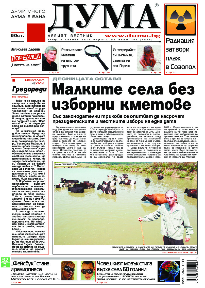 АБОНАМЕНТ за вестник „ДУМА“ за 2026 година. Можете да се абонирате в: „Български пощи“ АД до 15 декември 2025 г., „Доби прес“ ЕООД до 28 декември 2025 г., в редакцията на вестника до 20 декември 2025 г. Каталожен номер 6. Цени: 12 месеца - 149 € / 291,42 лв., 6 месеца - 75 € / 146,69 лв., 3 месеца - 40 € / 78,23 лв., 1 месец - 14 € / 27,38 лв. За повече информация тел. 02 9705 203 и 02 9705 216 отдел „Разпространение” на в-к ДУМА на ул. „Позитано” 20 А. E-mail: abonament@duma.bg АБОНАМЕНТ за вестник „ДУМА“ за 2026 година. Можете да се абонирате в: „Български пощи“ АД до 15 декември 2025 г., „Доби прес“ ЕООД до 28 декември 2025 г., в редакцията на вестника до 20 декември 2025 г. Каталожен номер 6. Цени: 12 месеца - 149 € / 291,42 лв., 6 месеца - 75 € / 146,69 лв., 3 месеца - 40 € / 78,23 лв., 1 месец - 14 € / 27,38 лв. За повече информация тел. 02 9705 203 и 02 9705 216 отдел „Разпространение” на в-к ДУМА на ул. „Позитано” 20 А. E-mail: abonament@duma.bg