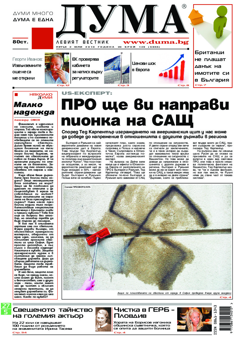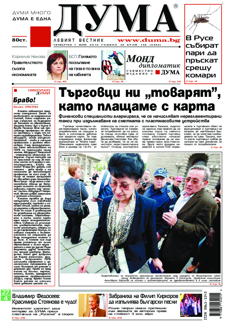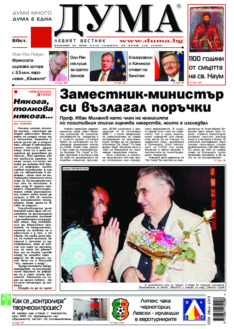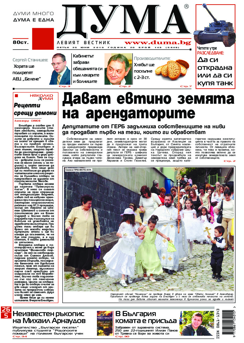 АБОНАМЕНТ за вестник „ДУМА“ за 2026 година. Можете да се абонирате в: „Български пощи“ АД до 15 декември 2025 г., „Доби прес“ ЕООД до 28 декември 2025 г., в редакцията на вестника до 20 декември 2025 г. Каталожен номер 6. Цени: 12 месеца - 149 € / 291,42 лв., 6 месеца - 75 € / 146,69 лв., 3 месеца - 40 € / 78,23 лв., 1 месец - 14 € / 27,38 лв. За повече информация тел. 02 9705 203 и 02 9705 216 отдел „Разпространение” на в-к ДУМА на ул. „Позитано” 20 А. E-mail: abonament@duma.bg АБОНАМЕНТ за вестник „ДУМА“ за 2026 година. Можете да се абонирате в: „Български пощи“ АД до 15 декември 2025 г., „Доби прес“ ЕООД до 28 декември 2025 г., в редакцията на вестника до 20 декември 2025 г. Каталожен номер 6. Цени: 12 месеца - 149 € / 291,42 лв., 6 месеца - 75 € / 146,69 лв., 3 месеца - 40 € / 78,23 лв., 1 месец - 14 € / 27,38 лв. За повече информация тел. 02 9705 203 и 02 9705 216 отдел „Разпространение” на в-к ДУМА на ул. „Позитано” 20 А. E-mail: abonament@duma.bg