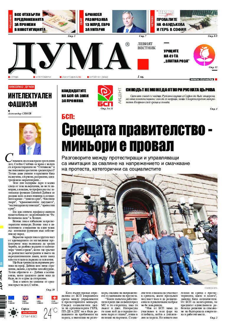 АБОНАМЕНТ за вестник „ДУМА“ за 2026 година. Можете да се абонирате в: „Български пощи“ АД до 15 декември 2025 г., „Доби прес“ ЕООД до 28 декември 2025 г., в редакцията на вестника до 20 декември 2025 г. Каталожен номер 6. Цени: 12 месеца - 149 € / 291,42 лв., 6 месеца - 75 € / 146,69 лв., 3 месеца - 40 € / 78,23 лв., 1 месец - 14 € / 27,38 лв. За повече информация тел. 02 9705 203 и 02 9705 216 отдел „Разпространение” на в-к ДУМА на ул. „Позитано” 20 А. E-mail: abonament@duma.bg АБОНАМЕНТ за вестник „ДУМА“ за 2026 година. Можете да се абонирате в: „Български пощи“ АД до 15 декември 2025 г., „Доби прес“ ЕООД до 28 декември 2025 г., в редакцията на вестника до 20 декември 2025 г. Каталожен номер 6. Цени: 12 месеца - 149 € / 291,42 лв., 6 месеца - 75 € / 146,69 лв., 3 месеца - 40 € / 78,23 лв., 1 месец - 14 € / 27,38 лв. За повече информация тел. 02 9705 203 и 02 9705 216 отдел „Разпространение” на в-к ДУМА на ул. „Позитано” 20 А. E-mail: abonament@duma.bg