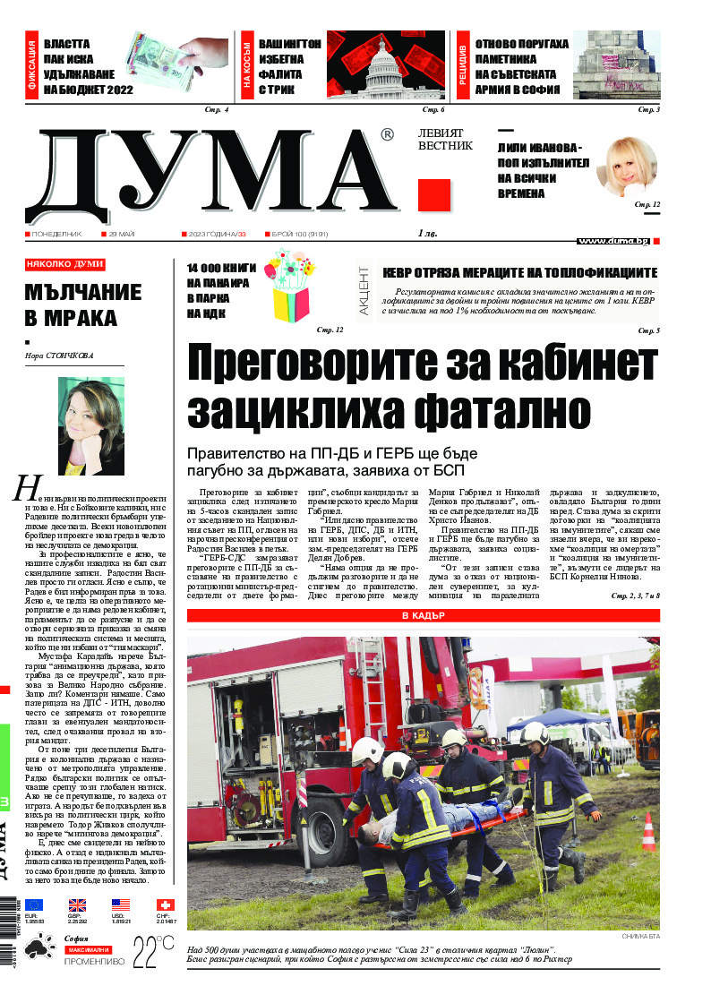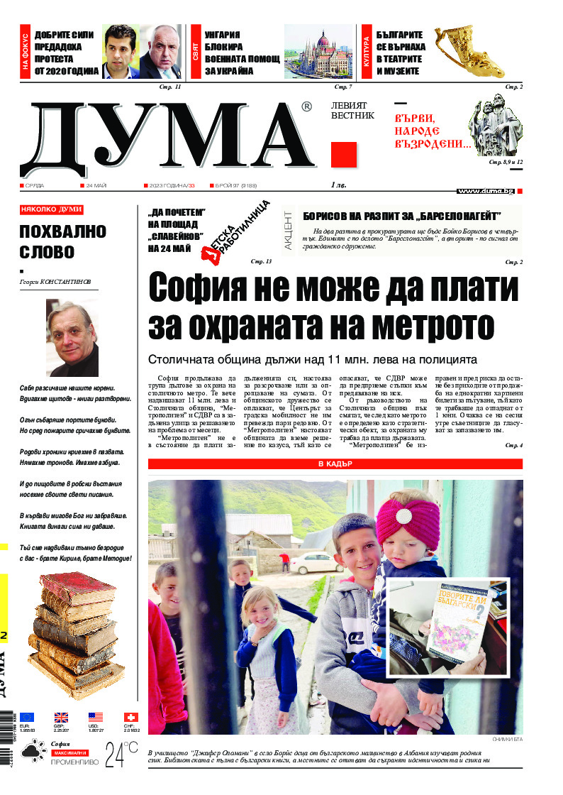 АБОНАМЕНТ за вестник „ДУМА“ за 2026 година. Можете да се абонирате в: „Български пощи“ АД до 15 декември 2025 г., „Доби прес“ ЕООД до 28 декември 2025 г., в редакцията на вестника до 20 декември 2025 г. Каталожен номер 6. Цени: 12 месеца - 149 € / 291,42 лв., 6 месеца - 75 € / 146,69 лв., 3 месеца - 40 € / 78,23 лв., 1 месец - 14 € / 27,38 лв. За повече информация тел. 02 9705 203 и 02 9705 216 отдел „Разпространение” на в-к ДУМА на ул. „Позитано” 20 А. E-mail: abonament@duma.bg АБОНАМЕНТ за вестник „ДУМА“ за 2026 година. Можете да се абонирате в: „Български пощи“ АД до 15 декември 2025 г., „Доби прес“ ЕООД до 28 декември 2025 г., в редакцията на вестника до 20 декември 2025 г. Каталожен номер 6. Цени: 12 месеца - 149 € / 291,42 лв., 6 месеца - 75 € / 146,69 лв., 3 месеца - 40 € / 78,23 лв., 1 месец - 14 € / 27,38 лв. За повече информация тел. 02 9705 203 и 02 9705 216 отдел „Разпространение” на в-к ДУМА на ул. „Позитано” 20 А. E-mail: abonament@duma.bg