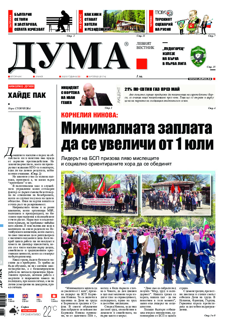 АБОНАМЕНТ за вестник „ДУМА“ за 2026 година. Можете да се абонирате в: „Български пощи“ АД до 15 декември 2025 г., „Доби прес“ ЕООД до 28 декември 2025 г., в редакцията на вестника до 20 декември 2025 г. Каталожен номер 6. Цени: 12 месеца - 149 € / 291,42 лв., 6 месеца - 75 € / 146,69 лв., 3 месеца - 40 € / 78,23 лв., 1 месец - 14 € / 27,38 лв. За повече информация тел. 02 9705 203 и 02 9705 216 отдел „Разпространение” на в-к ДУМА на ул. „Позитано” 20 А. E-mail: abonament@duma.bg АБОНАМЕНТ за вестник „ДУМА“ за 2026 година. Можете да се абонирате в: „Български пощи“ АД до 15 декември 2025 г., „Доби прес“ ЕООД до 28 декември 2025 г., в редакцията на вестника до 20 декември 2025 г. Каталожен номер 6. Цени: 12 месеца - 149 € / 291,42 лв., 6 месеца - 75 € / 146,69 лв., 3 месеца - 40 € / 78,23 лв., 1 месец - 14 € / 27,38 лв. За повече информация тел. 02 9705 203 и 02 9705 216 отдел „Разпространение” на в-к ДУМА на ул. „Позитано” 20 А. E-mail: abonament@duma.bg