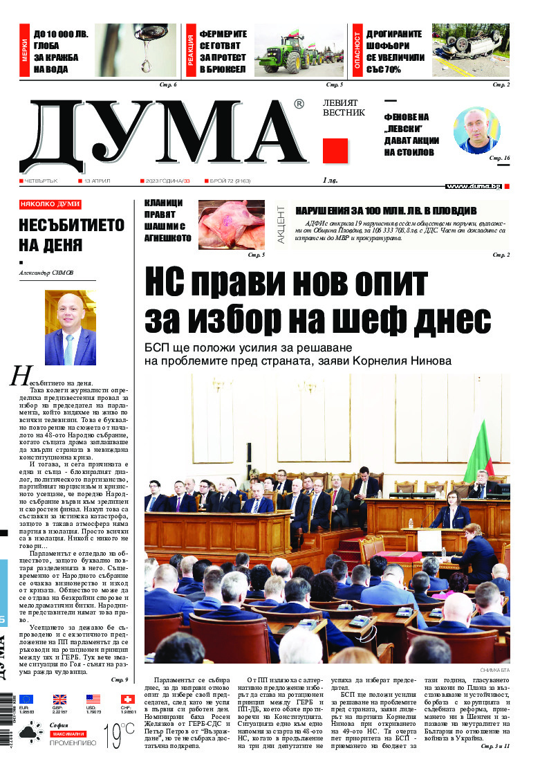 АБОНАМЕНТ за вестник „ДУМА“ за 2026 година. Можете да се абонирате в: „Български пощи“ АД до 15 декември 2025 г., „Доби прес“ ЕООД до 28 декември 2025 г., в редакцията на вестника до 20 декември 2025 г. Каталожен номер 6. Цени: 12 месеца - 149 € / 291,42 лв., 6 месеца - 75 € / 146,69 лв., 3 месеца - 40 € / 78,23 лв., 1 месец - 14 € / 27,38 лв. За повече информация тел. 02 9705 203 и 02 9705 216 отдел „Разпространение” на в-к ДУМА на ул. „Позитано” 20 А. E-mail: abonament@duma.bg АБОНАМЕНТ за вестник „ДУМА“ за 2026 година. Можете да се абонирате в: „Български пощи“ АД до 15 декември 2025 г., „Доби прес“ ЕООД до 28 декември 2025 г., в редакцията на вестника до 20 декември 2025 г. Каталожен номер 6. Цени: 12 месеца - 149 € / 291,42 лв., 6 месеца - 75 € / 146,69 лв., 3 месеца - 40 € / 78,23 лв., 1 месец - 14 € / 27,38 лв. За повече информация тел. 02 9705 203 и 02 9705 216 отдел „Разпространение” на в-к ДУМА на ул. „Позитано” 20 А. E-mail: abonament@duma.bg
