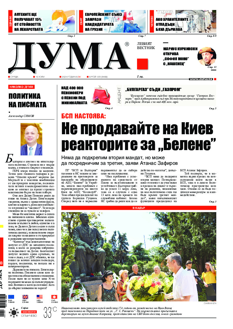 АБОНАМЕНТ за вестник „ДУМА“ за 2026 година. Можете да се абонирате в: „Български пощи“ АД до 15 декември 2025 г., „Доби прес“ ЕООД до 28 декември 2025 г., в редакцията на вестника до 20 декември 2025 г. Каталожен номер 6. Цени: 12 месеца - 149 € / 291,42 лв., 6 месеца - 75 € / 146,69 лв., 3 месеца - 40 € / 78,23 лв., 1 месец - 14 € / 27,38 лв. За повече информация тел. 02 9705 203 и 02 9705 216 отдел „Разпространение” на в-к ДУМА на ул. „Позитано” 20 А. E-mail: abonament@duma.bg АБОНАМЕНТ за вестник „ДУМА“ за 2026 година. Можете да се абонирате в: „Български пощи“ АД до 15 декември 2025 г., „Доби прес“ ЕООД до 28 декември 2025 г., в редакцията на вестника до 20 декември 2025 г. Каталожен номер 6. Цени: 12 месеца - 149 € / 291,42 лв., 6 месеца - 75 € / 146,69 лв., 3 месеца - 40 € / 78,23 лв., 1 месец - 14 € / 27,38 лв. За повече информация тел. 02 9705 203 и 02 9705 216 отдел „Разпространение” на в-к ДУМА на ул. „Позитано” 20 А. E-mail: abonament@duma.bg