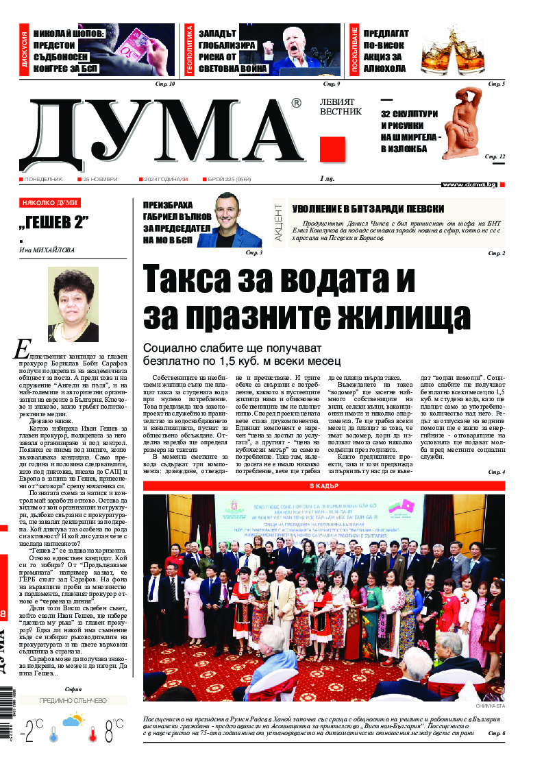 АБОНАМЕНТ за вестник „ДУМА“ за 2026 година. Можете да се абонирате в: „Български пощи“ АД до 15 декември 2025 г., „Доби прес“ ЕООД до 28 декември 2025 г., в редакцията на вестника до 20 декември 2025 г. Каталожен номер 6. Цени: 12 месеца - 149 € / 291,42 лв., 6 месеца - 75 € / 146,69 лв., 3 месеца - 40 € / 78,23 лв., 1 месец - 14 € / 27,38 лв. За повече информация тел. 02 9705 203 и 02 9705 216 отдел „Разпространение” на в-к ДУМА на ул. „Позитано” 20 А. E-mail: abonament@duma.bg АБОНАМЕНТ за вестник „ДУМА“ за 2026 година. Можете да се абонирате в: „Български пощи“ АД до 15 декември 2025 г., „Доби прес“ ЕООД до 28 декември 2025 г., в редакцията на вестника до 20 декември 2025 г. Каталожен номер 6. Цени: 12 месеца - 149 € / 291,42 лв., 6 месеца - 75 € / 146,69 лв., 3 месеца - 40 € / 78,23 лв., 1 месец - 14 € / 27,38 лв. За повече информация тел. 02 9705 203 и 02 9705 216 отдел „Разпространение” на в-к ДУМА на ул. „Позитано” 20 А. E-mail: abonament@duma.bg
