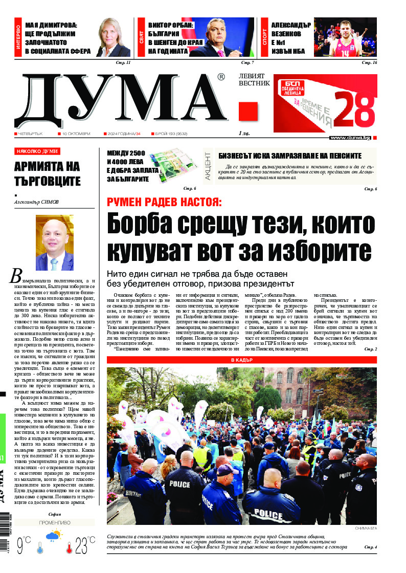 АБОНАМЕНТ за вестник „ДУМА“ за 2026 година. Можете да се абонирате в: „Български пощи“ АД до 15 декември 2025 г., „Доби прес“ ЕООД до 28 декември 2025 г., в редакцията на вестника до 20 декември 2025 г. Каталожен номер 6. Цени: 12 месеца - 149 € / 291,42 лв., 6 месеца - 75 € / 146,69 лв., 3 месеца - 40 € / 78,23 лв., 1 месец - 14 € / 27,38 лв. За повече информация тел. 02 9705 203 и 02 9705 216 отдел „Разпространение” на в-к ДУМА на ул. „Позитано” 20 А. E-mail: abonament@duma.bg АБОНАМЕНТ за вестник „ДУМА“ за 2026 година. Можете да се абонирате в: „Български пощи“ АД до 15 декември 2025 г., „Доби прес“ ЕООД до 28 декември 2025 г., в редакцията на вестника до 20 декември 2025 г. Каталожен номер 6. Цени: 12 месеца - 149 € / 291,42 лв., 6 месеца - 75 € / 146,69 лв., 3 месеца - 40 € / 78,23 лв., 1 месец - 14 € / 27,38 лв. За повече информация тел. 02 9705 203 и 02 9705 216 отдел „Разпространение” на в-к ДУМА на ул. „Позитано” 20 А. E-mail: abonament@duma.bg
