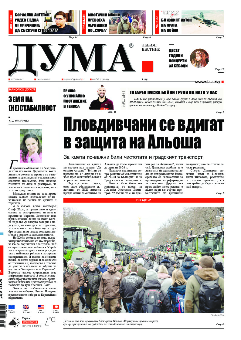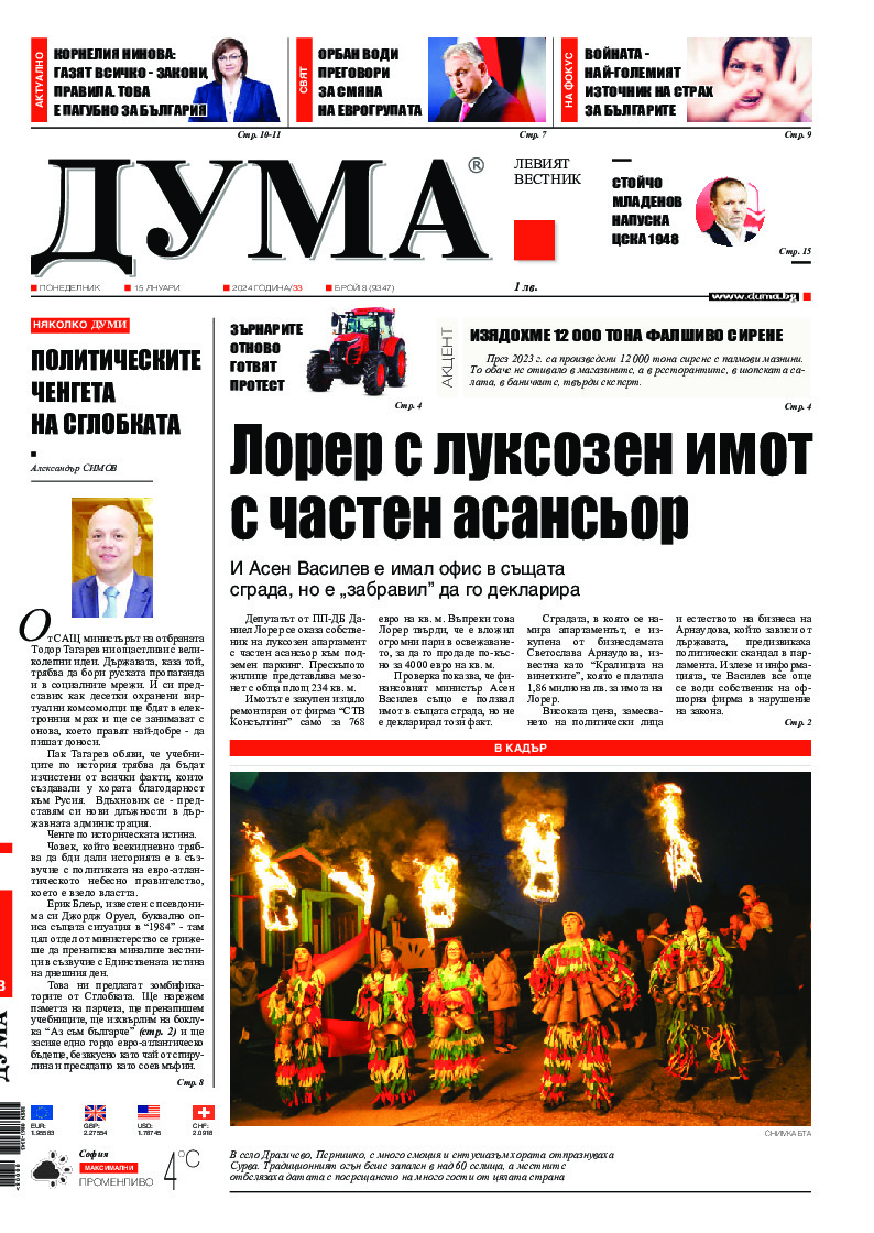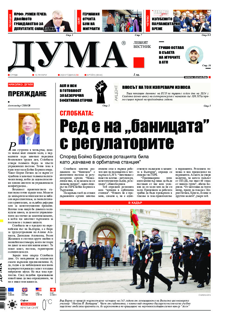 АБОНАМЕНТ за вестник „ДУМА“ за 2026 година. Можете да се абонирате в: „Български пощи“ АД до 15 декември 2025 г., „Доби прес“ ЕООД до 28 декември 2025 г., в редакцията на вестника до 20 декември 2025 г. Каталожен номер 6. Цени: 12 месеца - 149 € / 291,42 лв., 6 месеца - 75 € / 146,69 лв., 3 месеца - 40 € / 78,23 лв., 1 месец - 14 € / 27,38 лв. За повече информация тел. 02 9705 203 и 02 9705 216 отдел „Разпространение” на в-к ДУМА на ул. „Позитано” 20 А. E-mail: abonament@duma.bg АБОНАМЕНТ за вестник „ДУМА“ за 2026 година. Можете да се абонирате в: „Български пощи“ АД до 15 декември 2025 г., „Доби прес“ ЕООД до 28 декември 2025 г., в редакцията на вестника до 20 декември 2025 г. Каталожен номер 6. Цени: 12 месеца - 149 € / 291,42 лв., 6 месеца - 75 € / 146,69 лв., 3 месеца - 40 € / 78,23 лв., 1 месец - 14 € / 27,38 лв. За повече информация тел. 02 9705 203 и 02 9705 216 отдел „Разпространение” на в-к ДУМА на ул. „Позитано” 20 А. E-mail: abonament@duma.bg