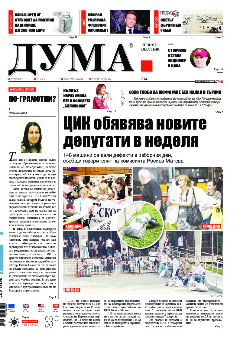 АБОНАМЕНТ за вестник „ДУМА“ за 2026 година. Можете да се абонирате в: „Български пощи“ АД до 15 декември 2025 г., „Доби прес“ ЕООД до 28 декември 2025 г., в редакцията на вестника до 20 декември 2025 г. Каталожен номер 6. Цени: 12 месеца - 149 € / 291,42 лв., 6 месеца - 75 € / 146,69 лв., 3 месеца - 40 € / 78,23 лв., 1 месец - 14 € / 27,38 лв. За повече информация тел. 02 9705 203 и 02 9705 216 отдел „Разпространение” на в-к ДУМА на ул. „Позитано” 20 А. E-mail: abonament@duma.bg АБОНАМЕНТ за вестник „ДУМА“ за 2026 година. Можете да се абонирате в: „Български пощи“ АД до 15 декември 2025 г., „Доби прес“ ЕООД до 28 декември 2025 г., в редакцията на вестника до 20 декември 2025 г. Каталожен номер 6. Цени: 12 месеца - 149 € / 291,42 лв., 6 месеца - 75 € / 146,69 лв., 3 месеца - 40 € / 78,23 лв., 1 месец - 14 € / 27,38 лв. За повече информация тел. 02 9705 203 и 02 9705 216 отдел „Разпространение” на в-к ДУМА на ул. „Позитано” 20 А. E-mail: abonament@duma.bg