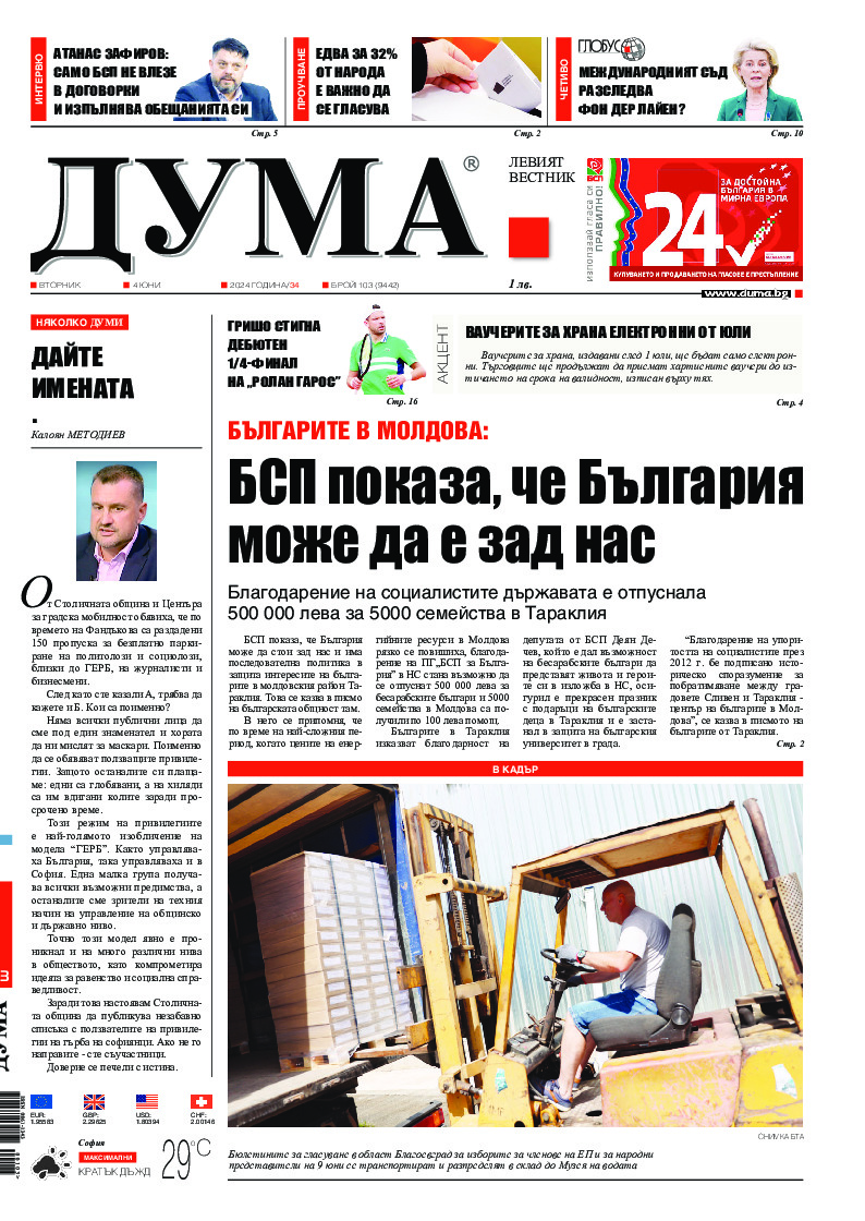 АБОНАМЕНТ за вестник „ДУМА“ за 2026 година. Можете да се абонирате в: „Български пощи“ АД до 15 декември 2025 г., „Доби прес“ ЕООД до 28 декември 2025 г., в редакцията на вестника до 20 декември 2025 г. Каталожен номер 6. Цени: 12 месеца - 149 € / 291,42 лв., 6 месеца - 75 € / 146,69 лв., 3 месеца - 40 € / 78,23 лв., 1 месец - 14 € / 27,38 лв. За повече информация тел. 02 9705 203 и 02 9705 216 отдел „Разпространение” на в-к ДУМА на ул. „Позитано” 20 А. E-mail: abonament@duma.bg АБОНАМЕНТ за вестник „ДУМА“ за 2026 година. Можете да се абонирате в: „Български пощи“ АД до 15 декември 2025 г., „Доби прес“ ЕООД до 28 декември 2025 г., в редакцията на вестника до 20 декември 2025 г. Каталожен номер 6. Цени: 12 месеца - 149 € / 291,42 лв., 6 месеца - 75 € / 146,69 лв., 3 месеца - 40 € / 78,23 лв., 1 месец - 14 € / 27,38 лв. За повече информация тел. 02 9705 203 и 02 9705 216 отдел „Разпространение” на в-к ДУМА на ул. „Позитано” 20 А. E-mail: abonament@duma.bg