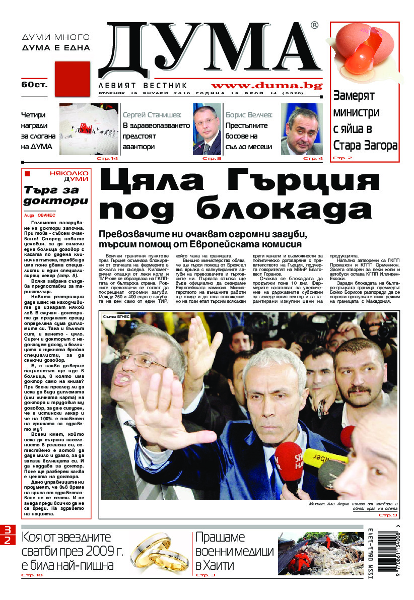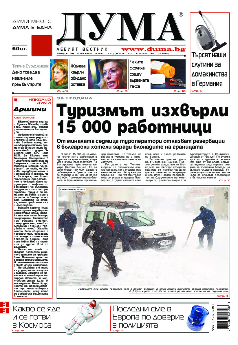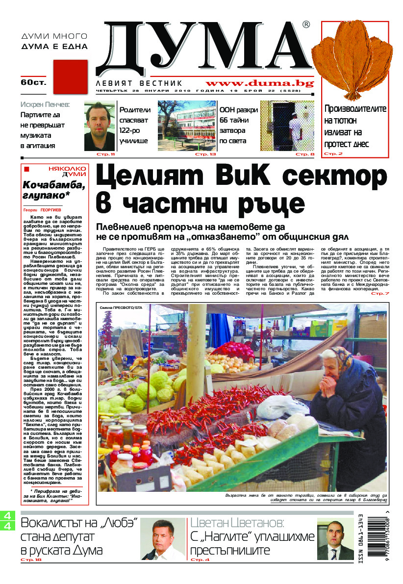 АБОНАМЕНТ за вестник „ДУМА“ за 2026 година. Можете да се абонирате в: „Български пощи“ АД до 15 декември 2025 г., „Доби прес“ ЕООД до 28 декември 2025 г., в редакцията на вестника до 20 декември 2025 г. Каталожен номер 6. Цени: 12 месеца - 149 € / 291,42 лв., 6 месеца - 75 € / 146,69 лв., 3 месеца - 40 € / 78,23 лв., 1 месец - 14 € / 27,38 лв. За повече информация тел. 02 9705 203 и 02 9705 216 отдел „Разпространение” на в-к ДУМА на ул. „Позитано” 20 А. E-mail: abonament@duma.bg АБОНАМЕНТ за вестник „ДУМА“ за 2026 година. Можете да се абонирате в: „Български пощи“ АД до 15 декември 2025 г., „Доби прес“ ЕООД до 28 декември 2025 г., в редакцията на вестника до 20 декември 2025 г. Каталожен номер 6. Цени: 12 месеца - 149 € / 291,42 лв., 6 месеца - 75 € / 146,69 лв., 3 месеца - 40 € / 78,23 лв., 1 месец - 14 € / 27,38 лв. За повече информация тел. 02 9705 203 и 02 9705 216 отдел „Разпространение” на в-к ДУМА на ул. „Позитано” 20 А. E-mail: abonament@duma.bg