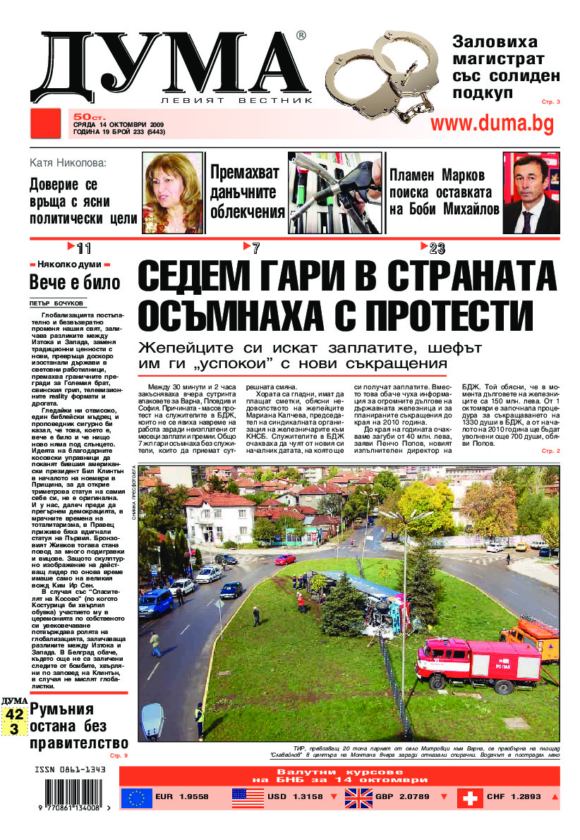 АБОНАМЕНТ за вестник „ДУМА“ за 2026 година. Можете да се абонирате в: „Български пощи“ АД до 15 декември 2025 г., „Доби прес“ ЕООД до 28 декември 2025 г., в редакцията на вестника до 20 декември 2025 г. Каталожен номер 6. Цени: 12 месеца - 149 € / 291,42 лв., 6 месеца - 75 € / 146,69 лв., 3 месеца - 40 € / 78,23 лв., 1 месец - 14 € / 27,38 лв. За повече информация тел. 02 9705 203 и 02 9705 216 отдел „Разпространение” на в-к ДУМА на ул. „Позитано” 20 А. E-mail: abonament@duma.bg АБОНАМЕНТ за вестник „ДУМА“ за 2026 година. Можете да се абонирате в: „Български пощи“ АД до 15 декември 2025 г., „Доби прес“ ЕООД до 28 декември 2025 г., в редакцията на вестника до 20 декември 2025 г. Каталожен номер 6. Цени: 12 месеца - 149 € / 291,42 лв., 6 месеца - 75 € / 146,69 лв., 3 месеца - 40 € / 78,23 лв., 1 месец - 14 € / 27,38 лв. За повече информация тел. 02 9705 203 и 02 9705 216 отдел „Разпространение” на в-к ДУМА на ул. „Позитано” 20 А. E-mail: abonament@duma.bg