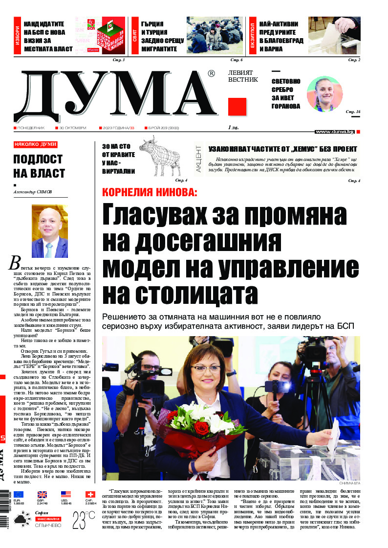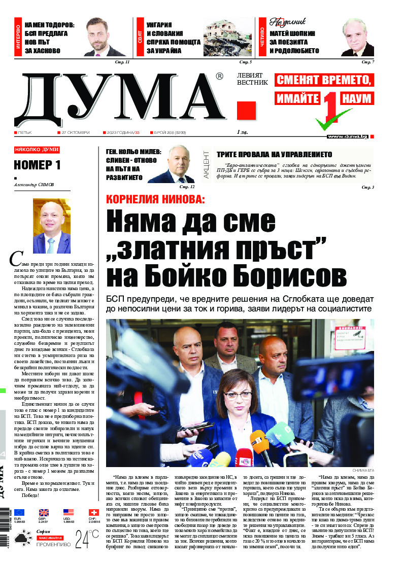 АБОНАМЕНТ за вестник „ДУМА“ за 2026 година. Можете да се абонирате в: „Български пощи“ АД до 15 декември 2025 г., „Доби прес“ ЕООД до 28 декември 2025 г., в редакцията на вестника до 20 декември 2025 г. Каталожен номер 6. Цени: 12 месеца - 149 € / 291,42 лв., 6 месеца - 75 € / 146,69 лв., 3 месеца - 40 € / 78,23 лв., 1 месец - 14 € / 27,38 лв. За повече информация тел. 02 9705 203 и 02 9705 216 отдел „Разпространение” на в-к ДУМА на ул. „Позитано” 20 А. E-mail: abonament@duma.bg АБОНАМЕНТ за вестник „ДУМА“ за 2026 година. Можете да се абонирате в: „Български пощи“ АД до 15 декември 2025 г., „Доби прес“ ЕООД до 28 декември 2025 г., в редакцията на вестника до 20 декември 2025 г. Каталожен номер 6. Цени: 12 месеца - 149 € / 291,42 лв., 6 месеца - 75 € / 146,69 лв., 3 месеца - 40 € / 78,23 лв., 1 месец - 14 € / 27,38 лв. За повече информация тел. 02 9705 203 и 02 9705 216 отдел „Разпространение” на в-к ДУМА на ул. „Позитано” 20 А. E-mail: abonament@duma.bg