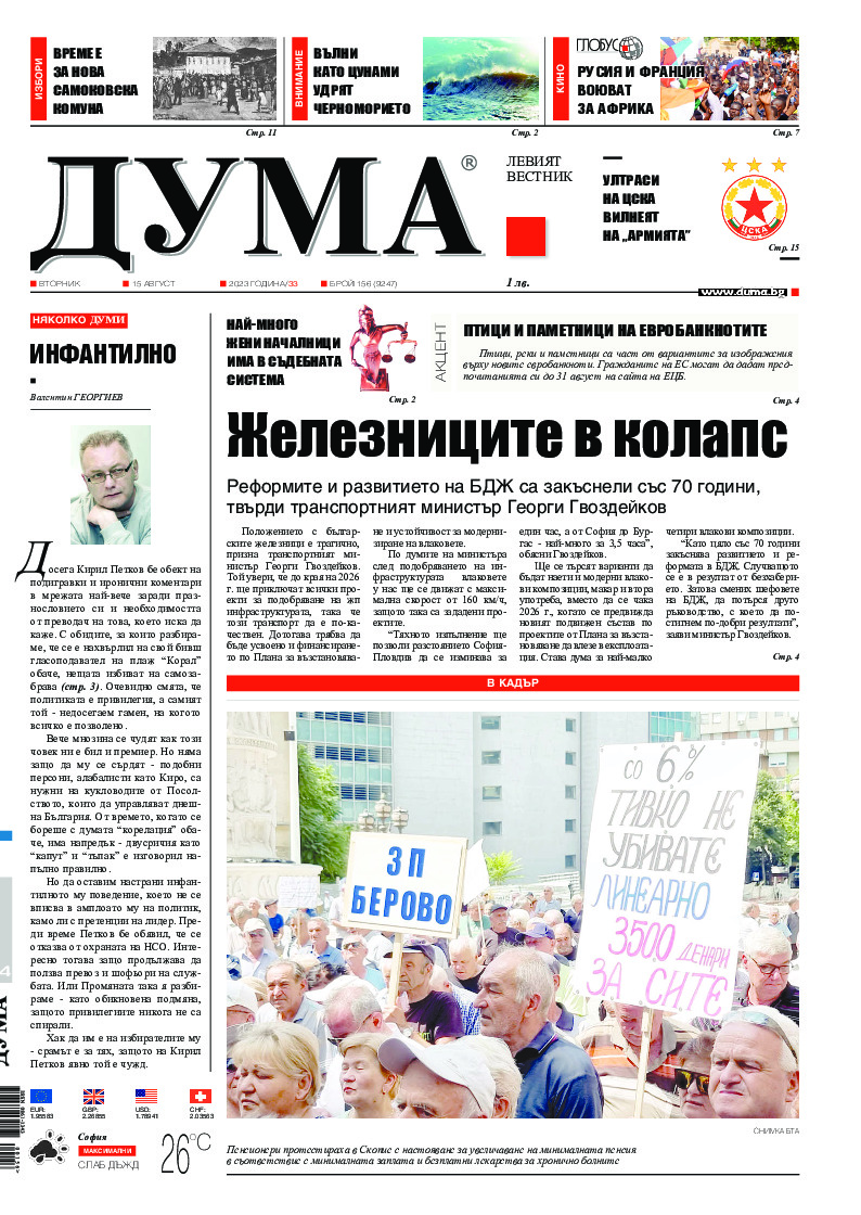 АБОНАМЕНТ за вестник „ДУМА“ за 2026 година. Можете да се абонирате в: „Български пощи“ АД до 15 декември 2025 г., „Доби прес“ ЕООД до 28 декември 2025 г., в редакцията на вестника до 20 декември 2025 г. Каталожен номер 6. Цени: 12 месеца - 149 € / 291,42 лв., 6 месеца - 75 € / 146,69 лв., 3 месеца - 40 € / 78,23 лв., 1 месец - 14 € / 27,38 лв. За повече информация тел. 02 9705 203 и 02 9705 216 отдел „Разпространение” на в-к ДУМА на ул. „Позитано” 20 А. E-mail: abonament@duma.bg АБОНАМЕНТ за вестник „ДУМА“ за 2026 година. Можете да се абонирате в: „Български пощи“ АД до 15 декември 2025 г., „Доби прес“ ЕООД до 28 декември 2025 г., в редакцията на вестника до 20 декември 2025 г. Каталожен номер 6. Цени: 12 месеца - 149 € / 291,42 лв., 6 месеца - 75 € / 146,69 лв., 3 месеца - 40 € / 78,23 лв., 1 месец - 14 € / 27,38 лв. За повече информация тел. 02 9705 203 и 02 9705 216 отдел „Разпространение” на в-к ДУМА на ул. „Позитано” 20 А. E-mail: abonament@duma.bg