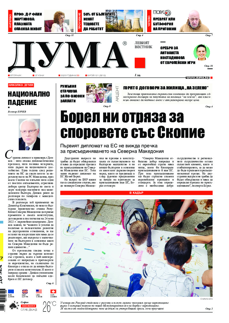 АБОНАМЕНТ за вестник „ДУМА“ за 2026 година. Можете да се абонирате в: „Български пощи“ АД до 15 декември 2025 г., „Доби прес“ ЕООД до 28 декември 2025 г., в редакцията на вестника до 20 декември 2025 г. Каталожен номер 6. Цени: 12 месеца - 149 € / 291,42 лв., 6 месеца - 75 € / 146,69 лв., 3 месеца - 40 € / 78,23 лв., 1 месец - 14 € / 27,38 лв. За повече информация тел. 02 9705 203 и 02 9705 216 отдел „Разпространение” на в-к ДУМА на ул. „Позитано” 20 А. E-mail: abonament@duma.bg АБОНАМЕНТ за вестник „ДУМА“ за 2026 година. Можете да се абонирате в: „Български пощи“ АД до 15 декември 2025 г., „Доби прес“ ЕООД до 28 декември 2025 г., в редакцията на вестника до 20 декември 2025 г. Каталожен номер 6. Цени: 12 месеца - 149 € / 291,42 лв., 6 месеца - 75 € / 146,69 лв., 3 месеца - 40 € / 78,23 лв., 1 месец - 14 € / 27,38 лв. За повече информация тел. 02 9705 203 и 02 9705 216 отдел „Разпространение” на в-к ДУМА на ул. „Позитано” 20 А. E-mail: abonament@duma.bg
