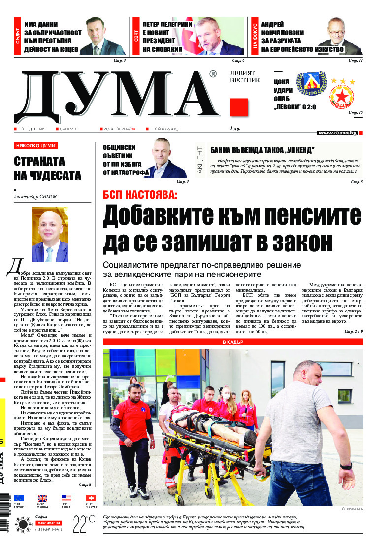 АБОНАМЕНТ за вестник „ДУМА“ за 2026 година. Можете да се абонирате в: „Български пощи“ АД до 15 декември 2025 г., „Доби прес“ ЕООД до 28 декември 2025 г., в редакцията на вестника до 20 декември 2025 г. Каталожен номер 6. Цени: 12 месеца - 149 € / 291,42 лв., 6 месеца - 75 € / 146,69 лв., 3 месеца - 40 € / 78,23 лв., 1 месец - 14 € / 27,38 лв. За повече информация тел. 02 9705 203 и 02 9705 216 отдел „Разпространение” на в-к ДУМА на ул. „Позитано” 20 А. E-mail: abonament@duma.bg АБОНАМЕНТ за вестник „ДУМА“ за 2026 година. Можете да се абонирате в: „Български пощи“ АД до 15 декември 2025 г., „Доби прес“ ЕООД до 28 декември 2025 г., в редакцията на вестника до 20 декември 2025 г. Каталожен номер 6. Цени: 12 месеца - 149 € / 291,42 лв., 6 месеца - 75 € / 146,69 лв., 3 месеца - 40 € / 78,23 лв., 1 месец - 14 € / 27,38 лв. За повече информация тел. 02 9705 203 и 02 9705 216 отдел „Разпространение” на в-к ДУМА на ул. „Позитано” 20 А. E-mail: abonament@duma.bg