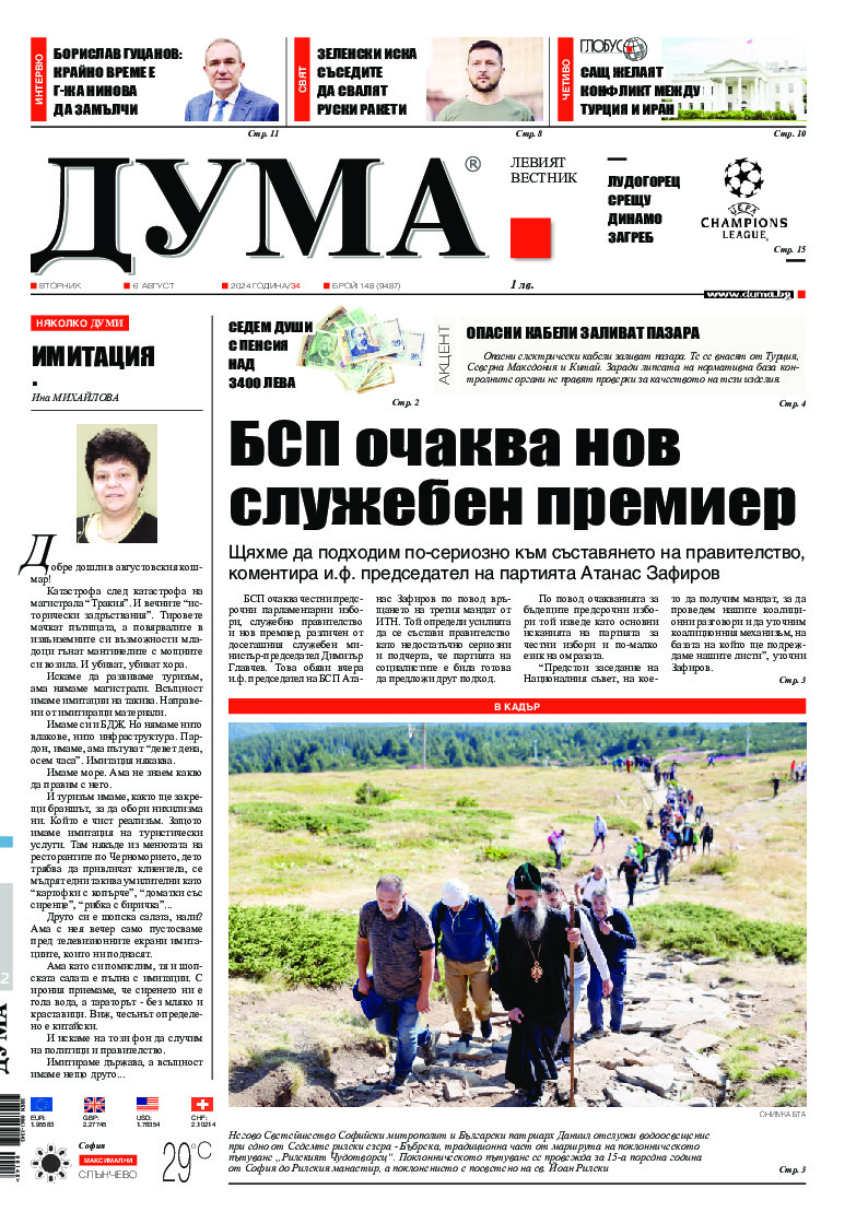 АБОНАМЕНТ за вестник „ДУМА“ за 2026 година. Можете да се абонирате в: „Български пощи“ АД до 15 декември 2025 г., „Доби прес“ ЕООД до 28 декември 2025 г., в редакцията на вестника до 20 декември 2025 г. Каталожен номер 6. Цени: 12 месеца - 149 € / 291,42 лв., 6 месеца - 75 € / 146,69 лв., 3 месеца - 40 € / 78,23 лв., 1 месец - 14 € / 27,38 лв. За повече информация тел. 02 9705 203 и 02 9705 216 отдел „Разпространение” на в-к ДУМА на ул. „Позитано” 20 А. E-mail: abonament@duma.bg АБОНАМЕНТ за вестник „ДУМА“ за 2026 година. Можете да се абонирате в: „Български пощи“ АД до 15 декември 2025 г., „Доби прес“ ЕООД до 28 декември 2025 г., в редакцията на вестника до 20 декември 2025 г. Каталожен номер 6. Цени: 12 месеца - 149 € / 291,42 лв., 6 месеца - 75 € / 146,69 лв., 3 месеца - 40 € / 78,23 лв., 1 месец - 14 € / 27,38 лв. За повече информация тел. 02 9705 203 и 02 9705 216 отдел „Разпространение” на в-к ДУМА на ул. „Позитано” 20 А. E-mail: abonament@duma.bg