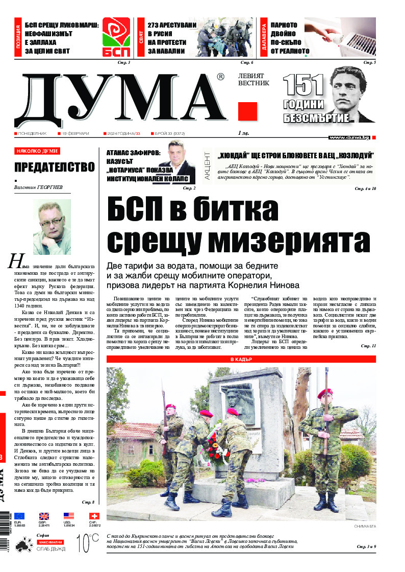АБОНАМЕНТ за вестник „ДУМА“ за 2026 година. Можете да се абонирате в: „Български пощи“ АД до 15 декември 2025 г., „Доби прес“ ЕООД до 28 декември 2025 г., в редакцията на вестника до 20 декември 2025 г. Каталожен номер 6. Цени: 12 месеца - 149 € / 291,42 лв., 6 месеца - 75 € / 146,69 лв., 3 месеца - 40 € / 78,23 лв., 1 месец - 14 € / 27,38 лв. За повече информация тел. 02 9705 203 и 02 9705 216 отдел „Разпространение” на в-к ДУМА на ул. „Позитано” 20 А. E-mail: abonament@duma.bg АБОНАМЕНТ за вестник „ДУМА“ за 2026 година. Можете да се абонирате в: „Български пощи“ АД до 15 декември 2025 г., „Доби прес“ ЕООД до 28 декември 2025 г., в редакцията на вестника до 20 декември 2025 г. Каталожен номер 6. Цени: 12 месеца - 149 € / 291,42 лв., 6 месеца - 75 € / 146,69 лв., 3 месеца - 40 € / 78,23 лв., 1 месец - 14 € / 27,38 лв. За повече информация тел. 02 9705 203 и 02 9705 216 отдел „Разпространение” на в-к ДУМА на ул. „Позитано” 20 А. E-mail: abonament@duma.bg