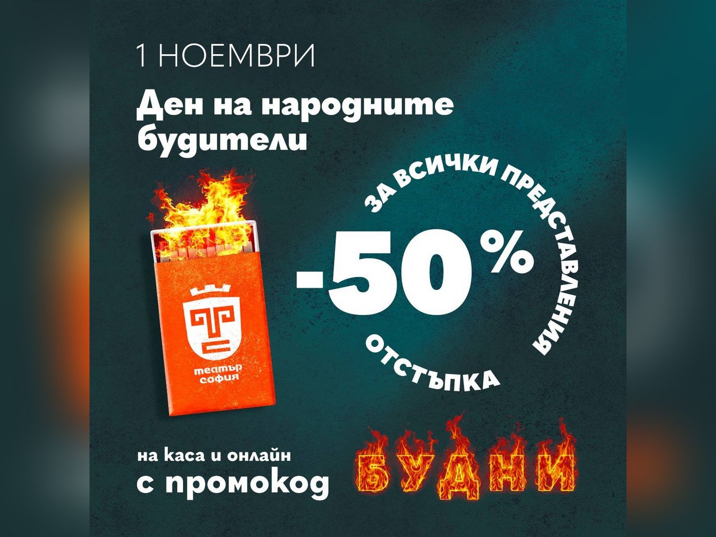 Денят на народните будители е ден на вдъхновение, осъзнатост и духовно пробуждане - ден, в който почитаме тези, посветили живота си на българската духовност, език и култура, и тези, които продължават тяхното дело, пишат от Театър "София". В духа на традициите и тази година, по повод Деня на народните будители, Театър "София" ще направи театралното изкуство по-достъпно. На 1 и 2 ноември желаещите може да се възползват от 50% отстъпка за всички представления от репертоара на театъра: онлайн с промокод БУДНИ, като се регистрират на https://sofiatheatre.eu/ и въведат промокод БУДНИ (изписан с главни букви); промокодът ще бъде активен от 00,01 ч. на 1 ноември до 23,59 ч. на 2 ноември; и на билетната каса на Театър "София" на ул. "Г. С. Раковски" 129.