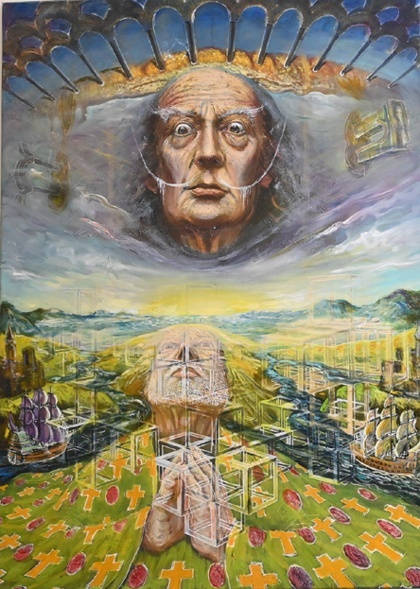 Много от творбите са чисти живописни алегории. Авторът разказва една история, една приказка, но я подхваща едновременно от различни краища. И започва едно роене на сцени, случките набъбват върху платното като шупнала мая и обемът на животоописанието изпреварва погледа на зрителя. Често в голeмите картини стълбите играят съществена роля. Разместени във всевъзможни посоки, в объркани перспективи, те движат събитията, героите се качват и слизат, често се въртят в кръг. Композициите са двуполюсни - горен и долен свят, в които антиподните състояния на сценографията създават усещане за игра.