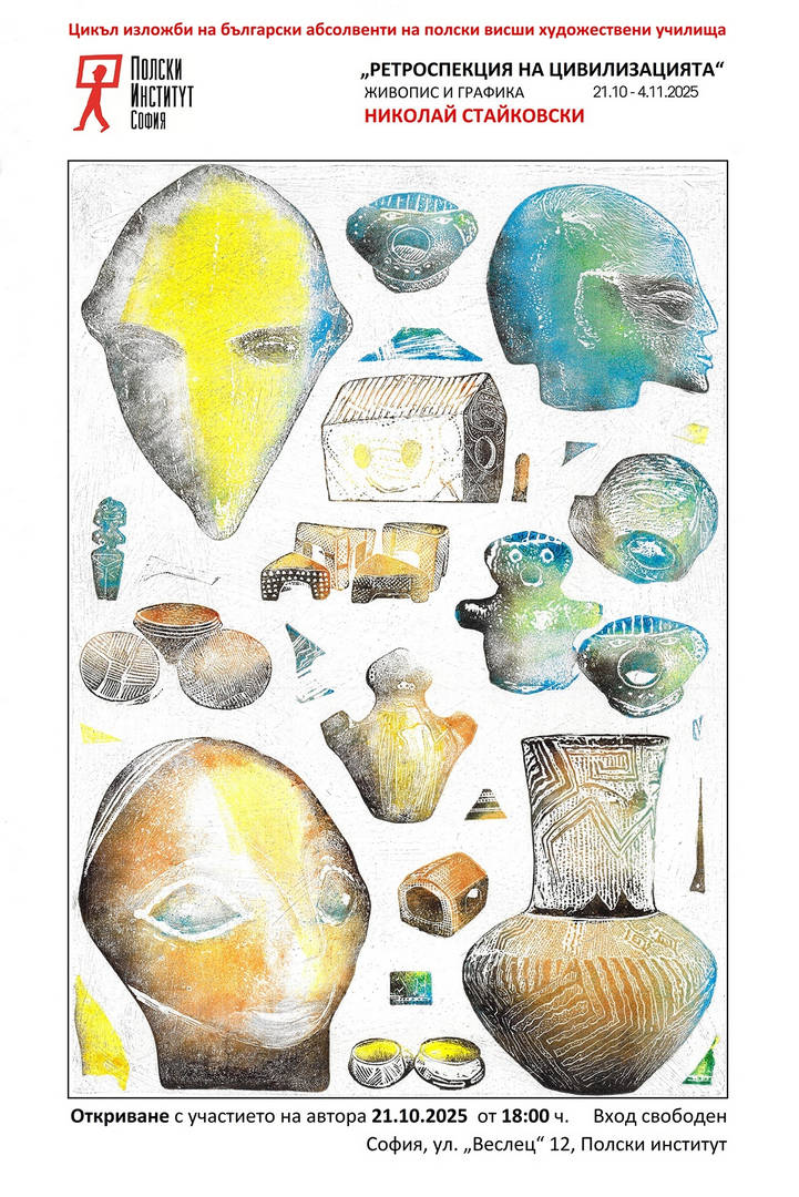 Цикъл изложби на български абсолвенти на полски висши художествени училища представя Полският институт в София. Изложбата на Николай Стайковски "Ретроспекция на цивилизацията" - живопис и графика, се открива с участието на автора на 21 октомври в 18 ч. в салона на ул. "Веслец" 12, вход свободен. Представените творби интерпретират европейското културно-историческо наследство от праисторията и Античността, през Средновековието и Възраждането, до новото време. Акцент са архитектурни пейзажи от стара Варшава, София, Братислава и други европейски градове. Произведенията са резултат от многогодишни историографски и естетически изследвания. Николай Стайковски завършва Художествената гимназия в София, след което продължава образованието си в Академията за изящни изкуства във Варшава. През 1987 г. придобива магистърска степен по "Графика" в Националната художествена академия в София. Участва в множество общи, представителни и художествени изложби. Реализирал е над 80 самостоятелни експозиции в България и в чужбина. Удостоен е с редица отличия, сред които втора награда в конкурса "Варшавска графика" (1999) и Специалната награда на Съюза на полските художници (2000).