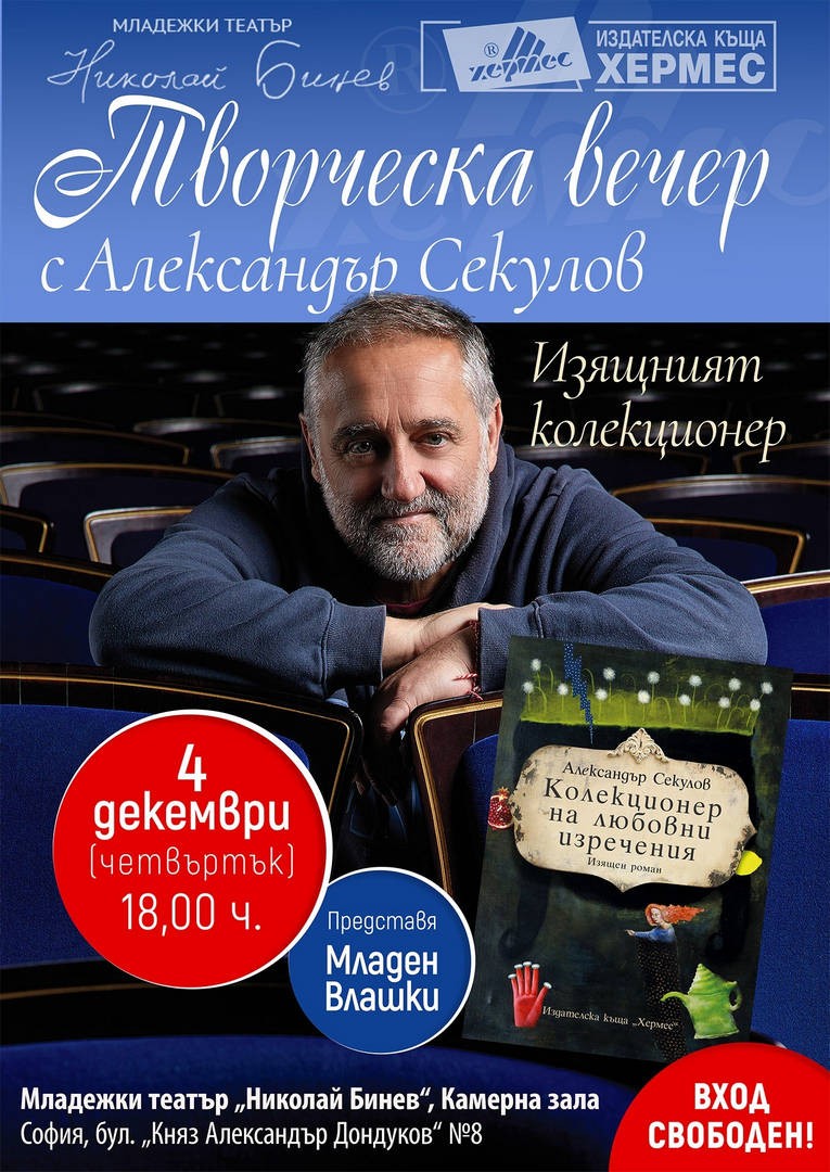 Творческа вечер с Александър Секулов под наслов "Изящният колекционер" ще се състои на 4 декември от 18 ч. в камерната зала на Младежкия театър "Николай Бинев", с вход свободен. За творчеството на Александър Секулов ще говори Младен Влашки. Александър Секулов е автор на романите "Колекционер на любовни изречения", "Малката светица и портокалите", "Господ слиза в Атина", "Островът", "Скитникът и синовете", "Жена на вятъра" и "Корабът на сирените". Издал е поетичните книги "Карти и географии", "Възхитително и леко", "Море на живите" и "Хроники и химни". Драматург е на Драматичния театър в Пловдив, отличен с "Аскеер" за пиесите "Няма ток за електрическия стол" (2016), "Дебелянов и ангелите" (2019) и "Народът на Вазов" (2022). Носител е на националните награди за поезия "Христо Фотев", "Николай Кънчев", "Перото", "Иван Николов".