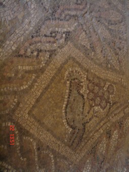 Петел, кълвящ грозд - детайл от мозайката "Сезони" върху пода на женската стая