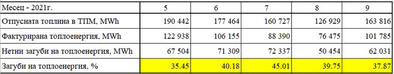 Дори при тези високи продажби (чрез настройките в абонатната станция), които успяват да продадат на потребителите безбожно количество топлоенергия, като им подгряват 1м3 вода със стойности от порядъка на 130-150 kWh, остават едни 35-45% топлоенергия, която се губи (също видно от таблицата).