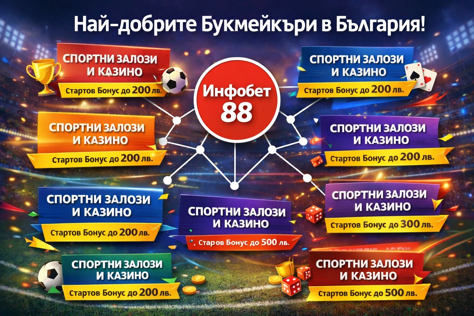 Посещавайки Infobet.bg, на началната страница се разкриват част от водещите букмейкъри в България. Според екипа това са най-добрите платформи, предлагащи високо ниво на сигурност, справедливи правила и нужното за всички ни многообразие.