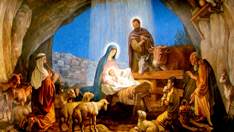 Според Евангелието Христос се ражда в пещера в град Витлеем, провинция Юдея. В момента на рождеството в небето пламва необикновена светлина и ангел възвестява, че на света е дошъл Спасителят. Витлеемските пастири са първите хора, които се покланят на Бога-Син. Почитат го и трима източни царе, доведени на мястото от изгрялата над небето звезда. Следвайки обичаите на времето, царете подаряват злато, ливан и смирна.