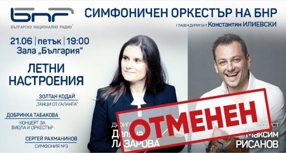 Поради независещи от нас обстоятелства, свързани със здравословното състояние на Маестра Деляна Лазарова, се налага концертът на Симфоничния оркестър на БНР "Летни настроения", планиран за 21 юни, да бъде отменен, съобщават от БНР. Поради това, премиерното изпълнение в България на Концерта за виола от Добринка Табакова с определените от нея изпълнители се отлага за неопределен период от време. Закупените билети ще важат без презаверка за концерта на Симфоничния оркестър на БНР на 5 юли от 19 ч. в зала "България" със солист Виктор Теодосиев и диригент Константин Илиевски.