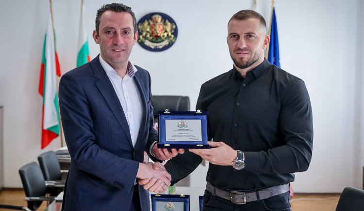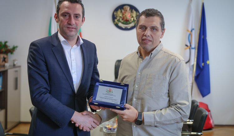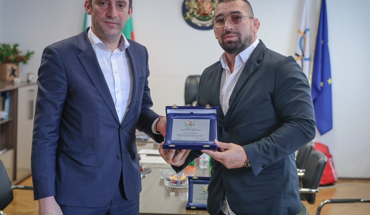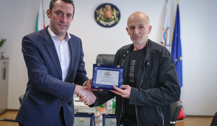 Министърът връчи почетни плакети и на треньорите Христо Христов и Николай Николов за приноса им към подготовката и успеха на националния отбор.