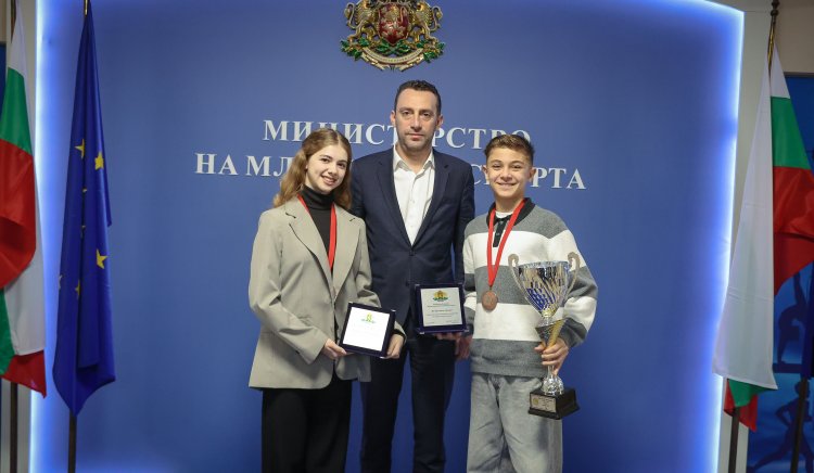Министър Пешев награди младите ни състезатели Кристиян Дончев и Мартина Кондаклиева, които спечелиха бронзов медал на Световното първенство по спортни танци за юноши в Бургас.