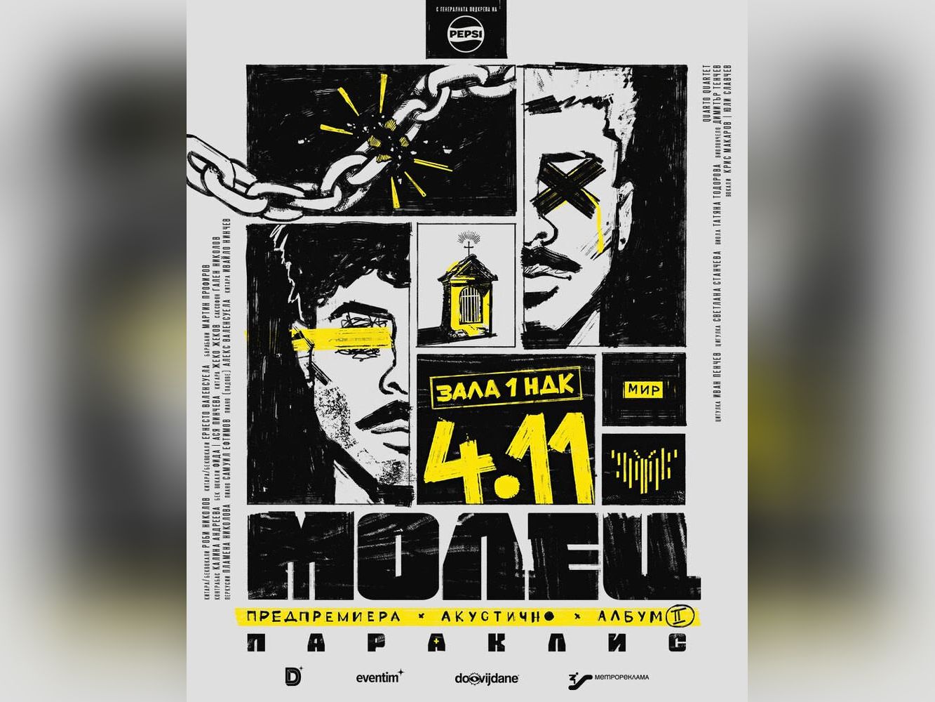 Група "Молец" представя нов албум с концерт на 4 ноември в София. "Мина година от "Арената" и мислим, че вече е време да се видим отново. Искаме да ви представим един по-интимен, по-личен и по-зрял албум в уюта на НДК - Зала 1, още преди да е видял бял свят", казват Крис Макаров и Юли Славчев. За представянето на новия проект, наречен "Параклис", дуото коментира, че са събрали "добре познатата армия от виртуозни музиканти, които нежно, но умело ще разкъсат сърцата на почитателите на живата музика. Отдавна не сме били толкова развълнувани да чуете". Всички песни ще бъдат изпълнени за първи и последен път в изцяло акустични аранжименти. На сцената ще излязат повече от десет музиканти, вокалното трио "Фида" и камерната формация "Quarto" - Иван Пенчев (цигулка), Светлана Станчева (цигулка), Татяна Тодорова (виола) и Димитър Тенчев (виолончело). В бенда на "Молец" са: Роби Николов (китара/беквокали), Ернесто Валенсуела (китара/беквокали), Мартин Профиров - барабани, Калина Андреева - контрабас, Жеко Жеков - китара, Гален Николов - саксофон, Пламена Николова - перкусии, Самуил Ефтимов - пиано, Алекс Валенсуела - пиано, Ивайло Нинчев - китара. Междувременно от групата съобщиха, че поради големия интерес ще има и втори концерт - на 5 ноември, отново в Зала 1 на НДК.
