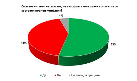 Близо 53% от българите смятат, че в момента има реална опасност от нова глобална война. Това се равнява на около 2,9 млн. души. Данните са от изследване на "Галъп интернешънъл", публикувано днес.