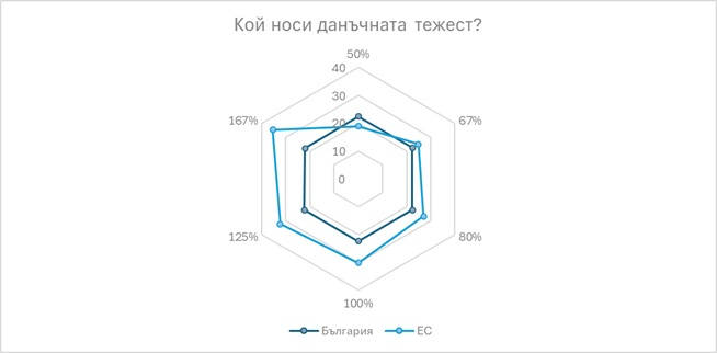 позволяват да се заключи, че за хората с по-високи доходи данъчната тежест в България е една от най-ниските в ЕС, а за хората с ниски доходи данъчната тежест е сред високите в ЕС. Данъчната система на България официално е прехвърлила данъчната тежест върху по-бедните хора, докато спестява данъци на по-богатите. Аргументът, че данъчната тежест за нискодоходните групи в България е по-голяма заради значителния дял на неформалната икономика е удобно извинение, демонстриращо едновременно административна немощ и лицемерие.