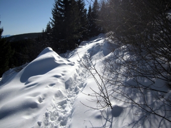 През оредялата гора в далечината се очерта силуетът на Черни връх, посипан с ледена "захар". Не след дълго преминах мостчето на реката, която бе изваяла през нощта феерични ледени висулки. Постепенно пътеката промени своя наклон. Реката се сниши в долината. Огромни борове, смърчове се възправяха безмилостно покосени, прекършени от силните смерчове, поръсени от белотата на снега. Налагаше се да ги заобикалям и прескачам, за да продължа нагоре. На едно място зърнах огромни следи - приличаха на мечи стъпки. Макар и да знаех, че мечките спят своя зимен сън, няма да скрия "вълнението" си. Може би все пак стъпките бяха на диво прасе или на по-голямо куче...