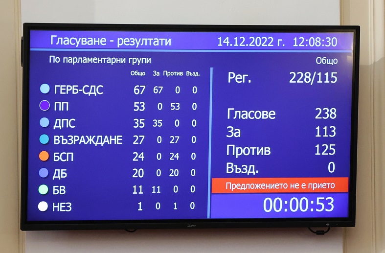 Народното събрание отхвърли кандидатурата на номинирания от ГЕРБ за премиер проф. Николай Габровски. Той получи подкрепата на 113 депутати, а против бяха 125. "Принципите в политиката победиха. Нашата позиция е отдавна, тя е принципна и последователна, така че с нищо не изненадваме", коментира Корнелия Нинова.