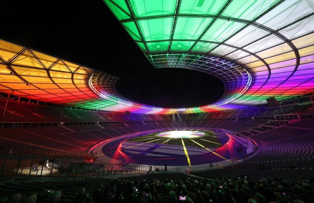 Шефът на УЕФА Александър Чеферин (вдясно) се поздравява с директора на Евро 2024 Филип Лам при представянето на логото на шампионата със зрелищно светлинно шоу на Олимпийския стадион в Берлин.