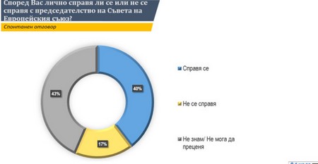 На въпрос успешно ли се справя България с председателството на Съвета на ЕС, 40 на сто отговарят положително. Други 43% обаче дават отговор "не знам", 17% смятат категорично, че не се справя.