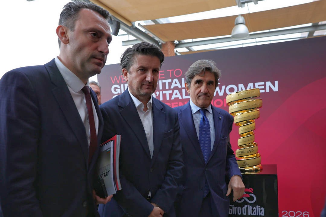 Министърът на младежта и спорта Иван Пешев (вляво) и колегата му от туризма Мирослав Боршош участват с президента на RCS Media Group Урбано Кайро в церемонията по представяне на 109-ото издание на колоездачната обиколка на Италия. Първите три етапа на "Джирото" догодина ще са в България