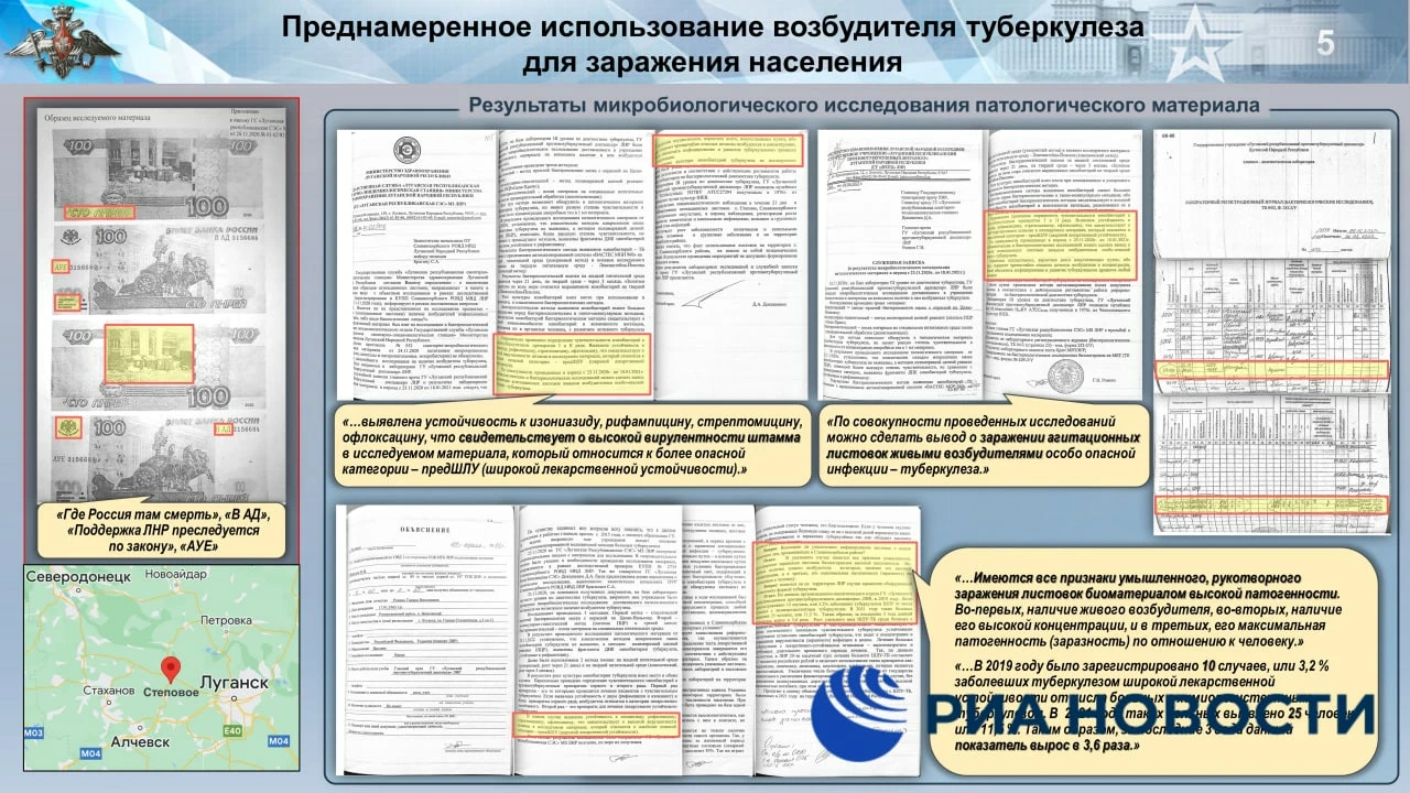 Ръководителят на войските на РХБЗ заяви, че по този начин Пентагонът е разширил значително своя изследователски потенциал „не само в областта на създаването на биологични оръжия, но и в получаването на информация за антибиотична резистентност и наличието на антитела срещу някои заболявания сред населението на конкретни региони“.