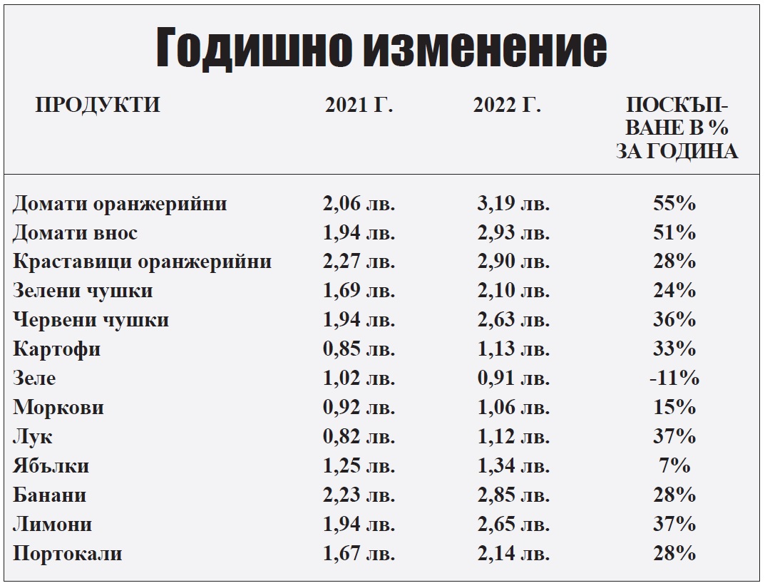 Но да се върнем у нас. Българите основно пазаруват храни, а тяхното повишение е много по-голямо от средните 16,9%. Данни на Държавната комисия по стоковите борси и тържищата (ДКСБТ) показват, че цените на хранителните продукти в България продължават да се покачват, като средното поскъпване за година е около 30%.