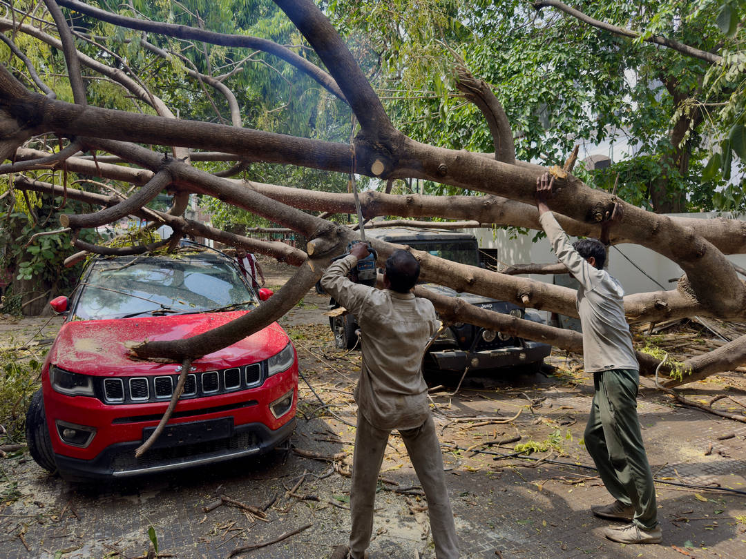 Индийци разчистват паднали клони върху автомобили. Част от страната бе обхваната от буря, придружена от силни ветрове