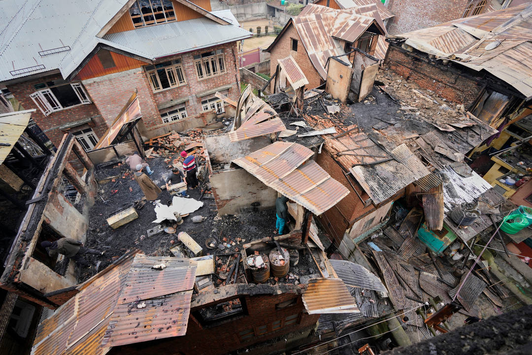 Мъже търсят оцеляла покъщнина, след като пожар обхвана няколко къщи в град Сринагар в Кашмир