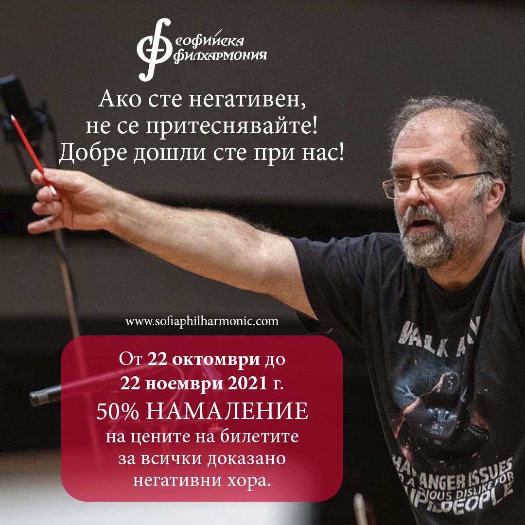 Ние уважаваме избора на всеки човек и не делим нашата публика на ваксинирани и неваксинирани. И понеже хората без сертификати ще трябва според наредбите да се тестват, намаляваме цените на билетите, за да компенсираме тази промяна, съобщават от Софийската филхармония.