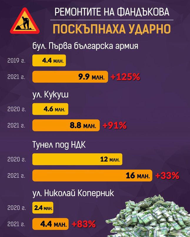 "Сравнявайки бюджетите на София за 2020 и 2021 г. се виждат стряскащи увеличения на цените, които Столичната община планира да плати за ремонти на едни и същи обекти. Например, дълго отлаганият ремонт на бул. Първа българска армия е поскъпнал почти три пъти. През 2019 г. за случването му са били заложени 4.4 млн. лв., през 2020 - 8.8 млн. лв. и вече 9.9 млн. лв. Избухването на разходите е със 125%", посочват от „Спаси София“.