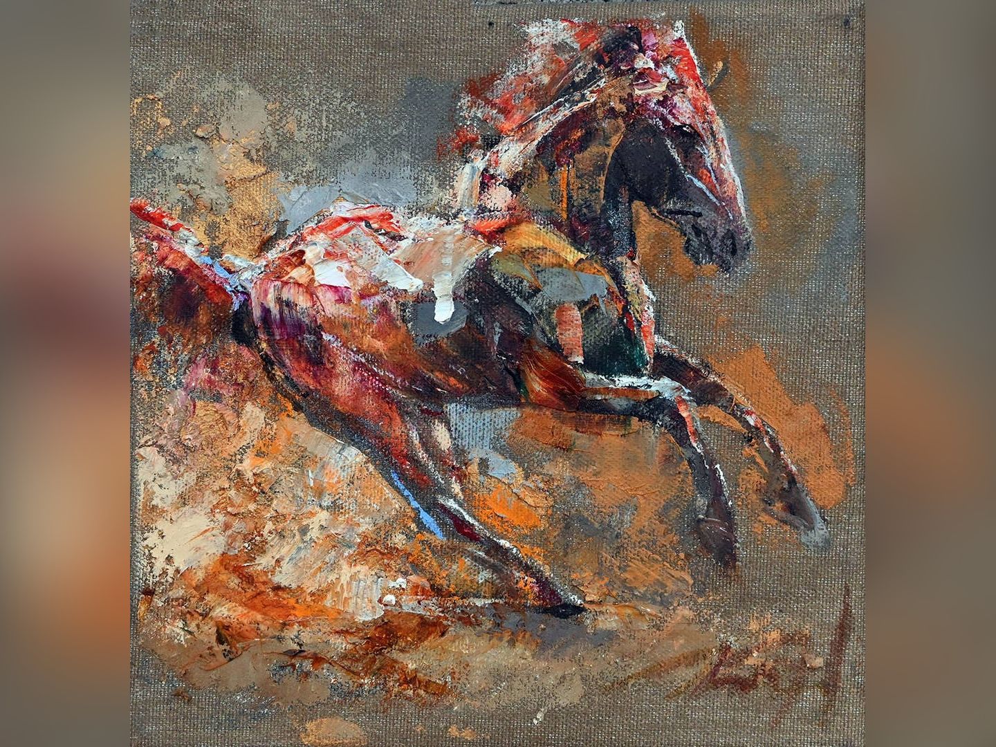 Конят е чист импулс. Взрив от движение. Свобода, която не търси посока. Формата му сякаш не успява да удържи енергията, която я задвижва. Боята се наслагва и изстъргва, съпротивлява се напразно. Няма дистанция между ръката, която рисува, и чувството, което я тласка към платното.