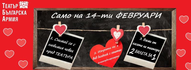 Тази година влюбените в театъра отново влизат с 1 билет. На 14 февруари всички купени билети за спектаклите на театъра ще са на половин цена. Единственото условие е да се изпрати снимка с любимия човек пред Театъра на армията и подаръкът е сигурен. На 14 февруари всеки билет ще е придружен с още един подарък - "Валентинка с театрално послание". Любими любовни цитати от спектаклите на ТБА ще напомнят на влюбените онези класически фрази от велики автори, които оживяват на сцената в Театъра на армията не само на Свети Валентин.