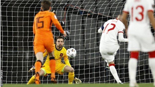 Нидерландците, трикратни световни вицешампиони, изостанаха, когато удар на Бурак Йълмаз (15) не успя да бъде избит с крак от вратаря Тим Крул. Пак Йълмаз (34) удвои от дузпа, а Maтейс де Лигт пропусна да намали с глава точно преди почивката, като ударът му бе изчистен от голлинията.