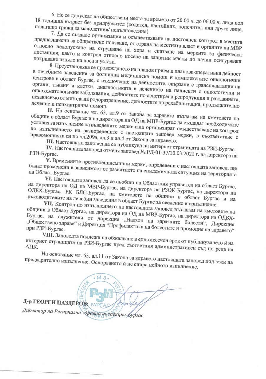 РЗИ – Бургас издаде заповед за допълнителни противоепидемични мерки срещу разпространението на COVID-19, които влизат в сила в Бургас от 18.00 часа днес, 24 март до 31 март, съобщиха от общината.